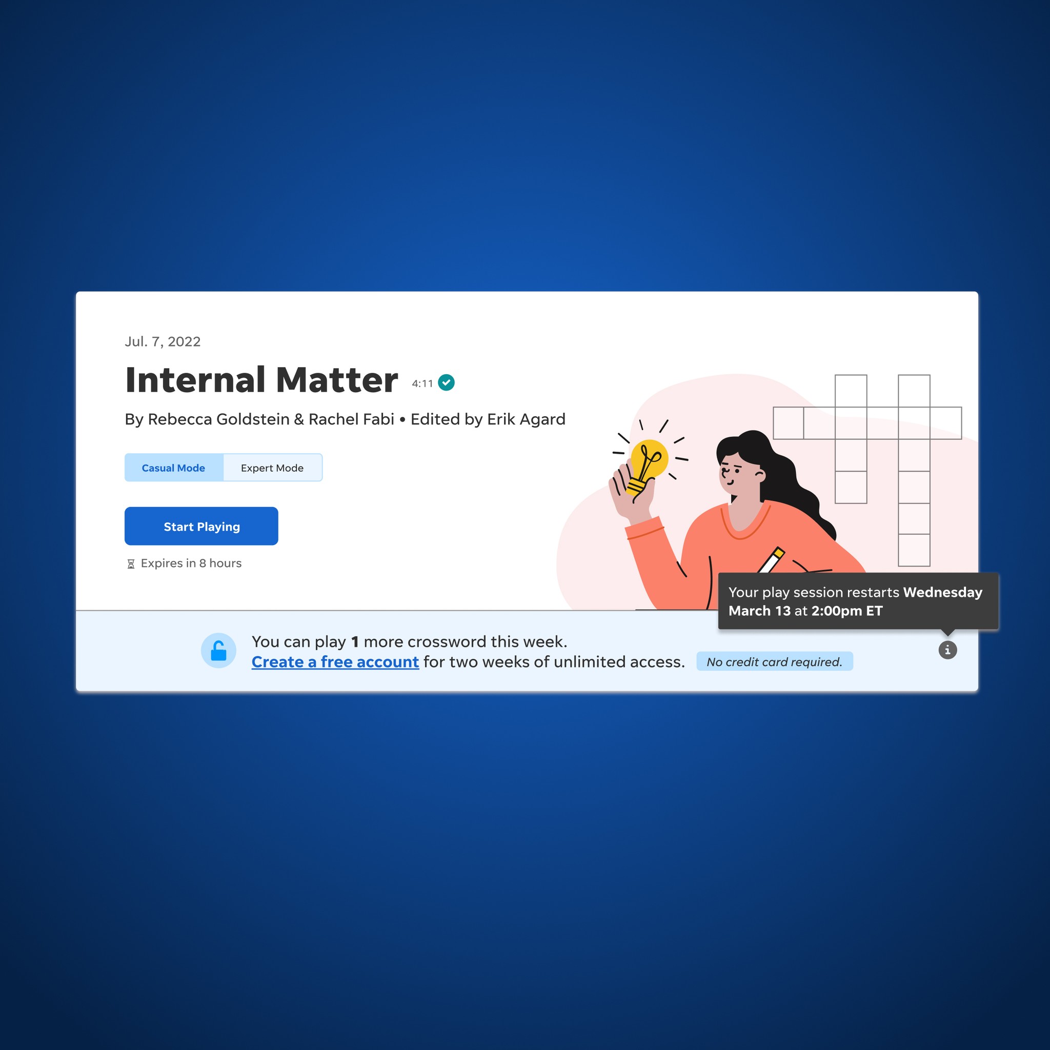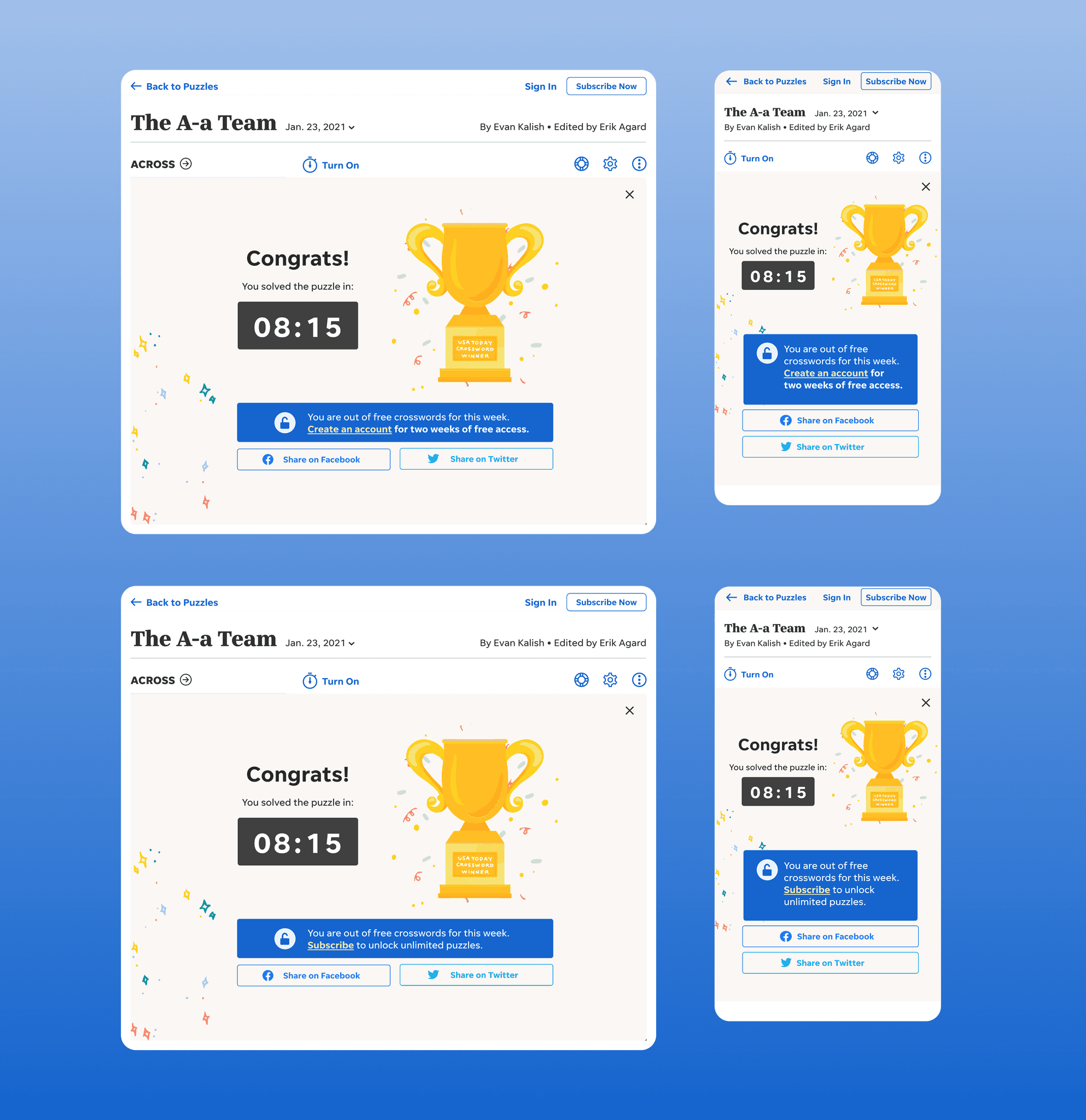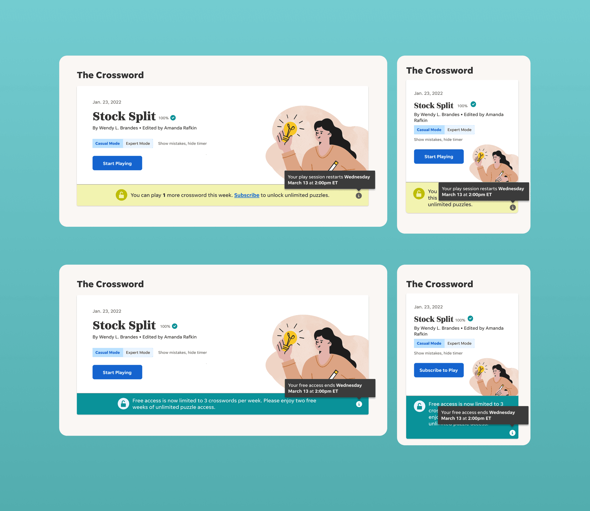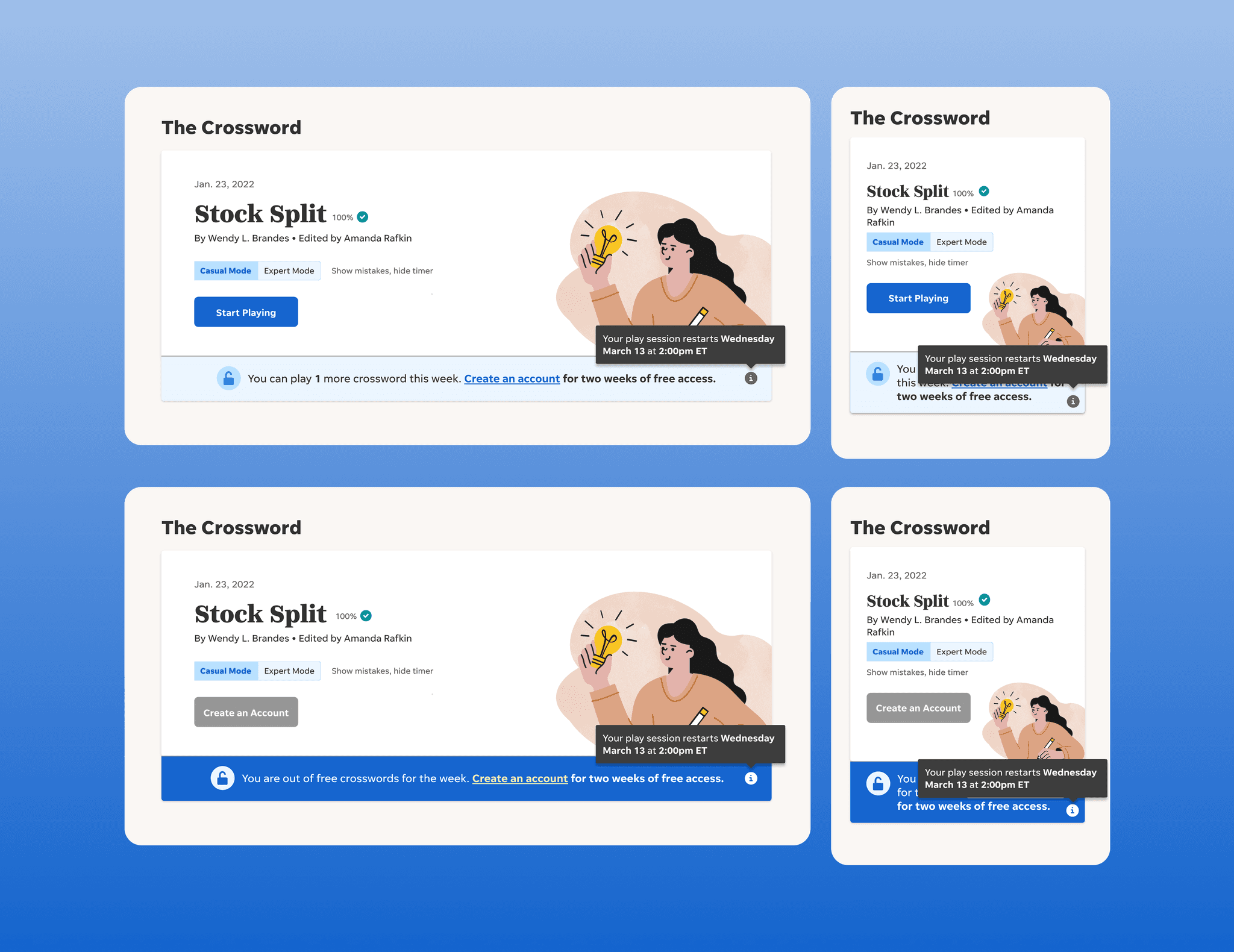 The meter messaging component was strategically integrated throughout the Crossword experience—from the start screen to mid-game pauses and reward screens. It reminded free and registered users how many games they had left each week and included tooltips to clarify when free plays would reset. The component was added to the USA TODAY design system for consistent, scalable use.